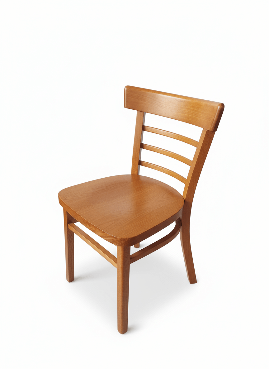 Silla de madera con acabado barnizado.